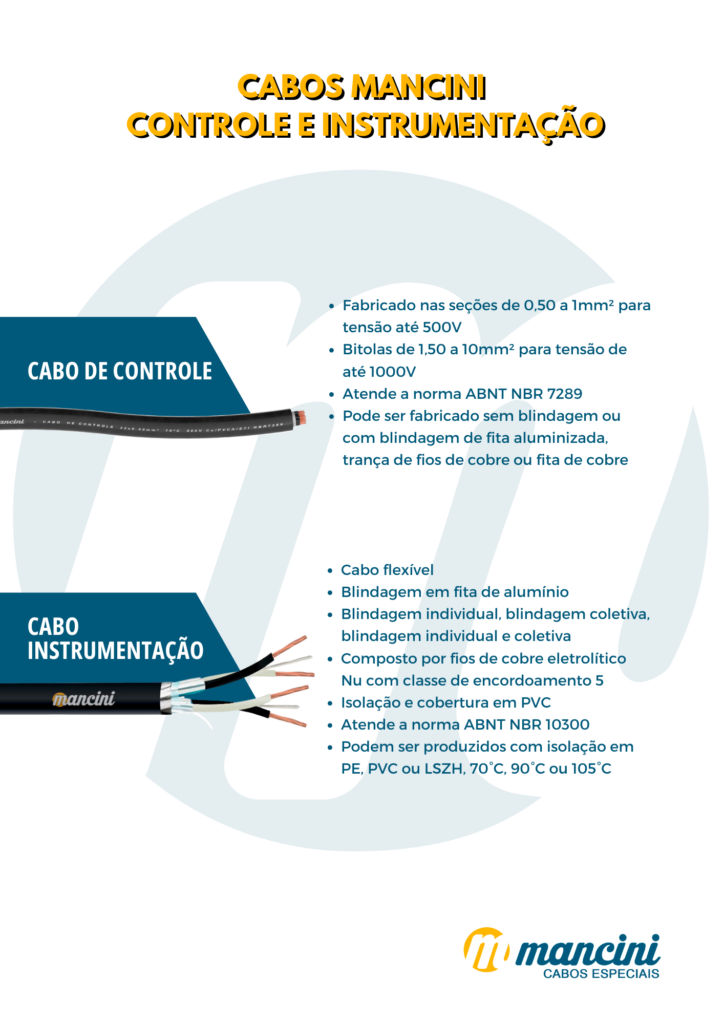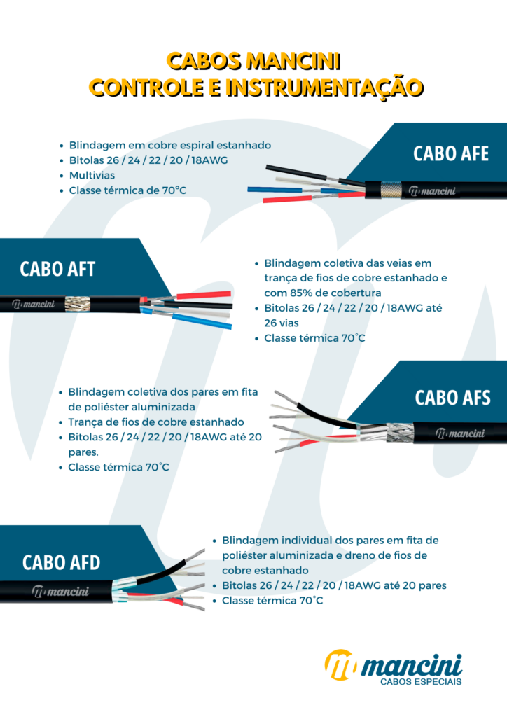Os Cabos Mancini AFT (áudio frequência trançado) , AFE (áudio frequência espiral), AFD (com blindagem par-a-par) e AFS (com dupla blindagem em fita luminizada e malha de cobre estanhado) são muito utilizados para conectar dispositivos de controle, como sensores, atuadores e controladores lógicos programáveis (CLPs) ao sistema de automação.